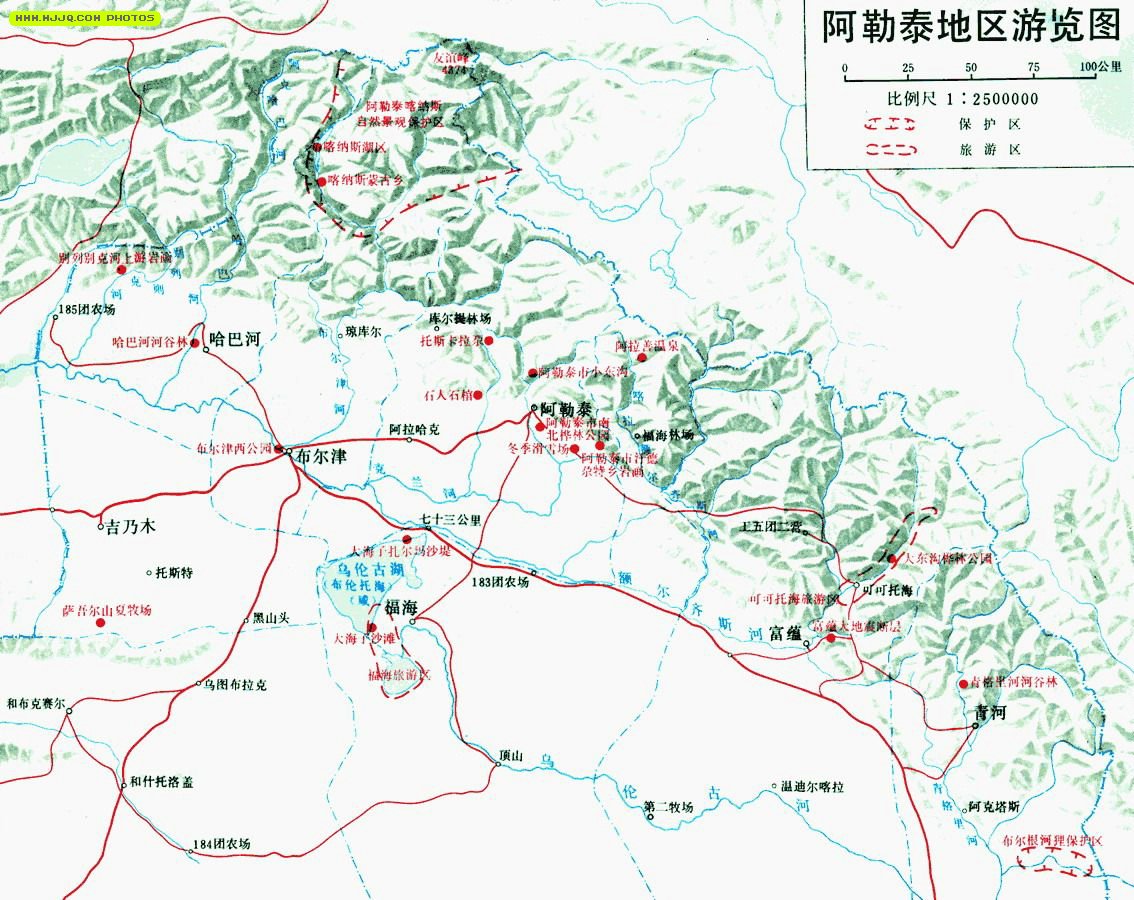 阿勒泰地區(qū)有高山森林、河谷風(fēng)光、湖泊溫泉、巖畫(huà)石刻等旅游資源數(shù)量為185處。這里有美麗的喀納斯湖風(fēng)景區(qū)、布爾根河河貍自然保護(hù)區(qū)、福海海濱風(fēng)景區(qū)、蝴蝶溝、烏倫古湖海濱浴場(chǎng)、白沙湖、鳴沙山,以及高山風(fēng)光、冰川雪嶺、湖泊溫泉、巖畫(huà)石刻,切木爾切克古墓群及草原石人阿勒泰市四面環(huán)山,地形奇異。