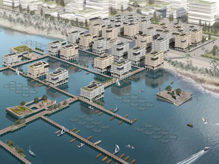 通過和大海建立良好的互動關系,市民們將享受到熱帶雨林公園,運河,湖水和沙灘。區(qū)域規(guī)劃將主要致力于沿海社區(qū),使?jié)O業(yè)可以蓬勃發(fā)展。漁民們的住宅集合地附近將有空間方便船只??俊4送?,通過建造巨型海堤來幫助雅加達地區(qū)免受洪水的侵襲。