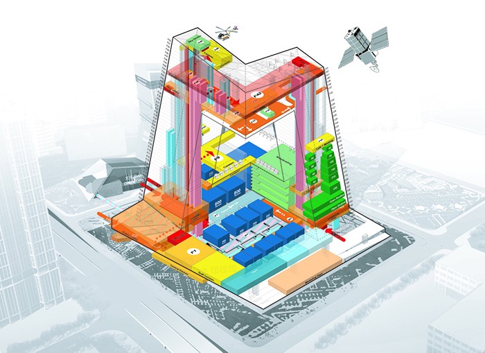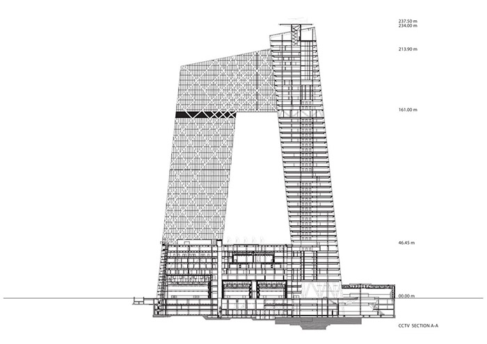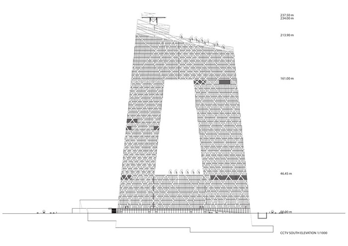 CCTV大樓的形式有助于將電視制作的整個工作流程組合在一個緊密相連的環(huán)路中。兩座塔樓從一個容納演了制作播室的共同基座上升起,并有所分工﹕塔樓壹是編輯和辦公區(qū),而較低的塔樓貳則主要服務(wù)于新聞制播。兩座塔樓由通過容納行政管理區(qū)的空中之橋——懸臂連接在一起。
